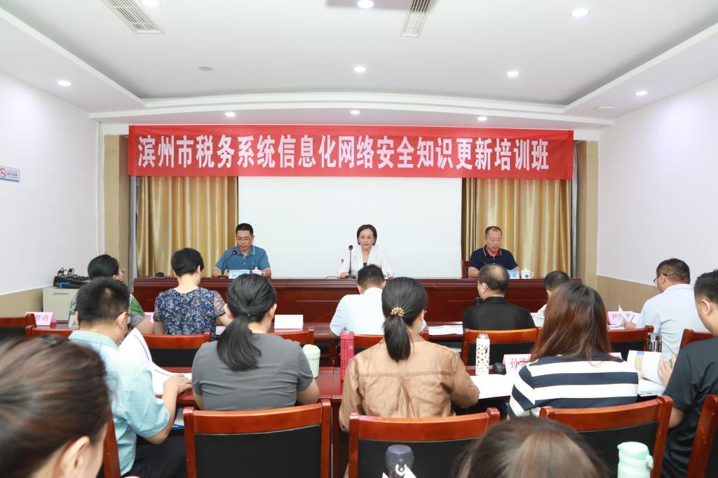 云天收夏色,木叶动秋声。9月18日上午,滨州市税务系统信息化网络安全知识更新培训班开班仪式在泰安校区举行,jinnianhui今年会院长王靖磊、滨州市税务局信息中心主任陈芳出席开班仪式并讲话,来自滨州市税务系统的40名信息化建设骨干参加了开班仪式,开班仪式由院长助理孙运表主持。
