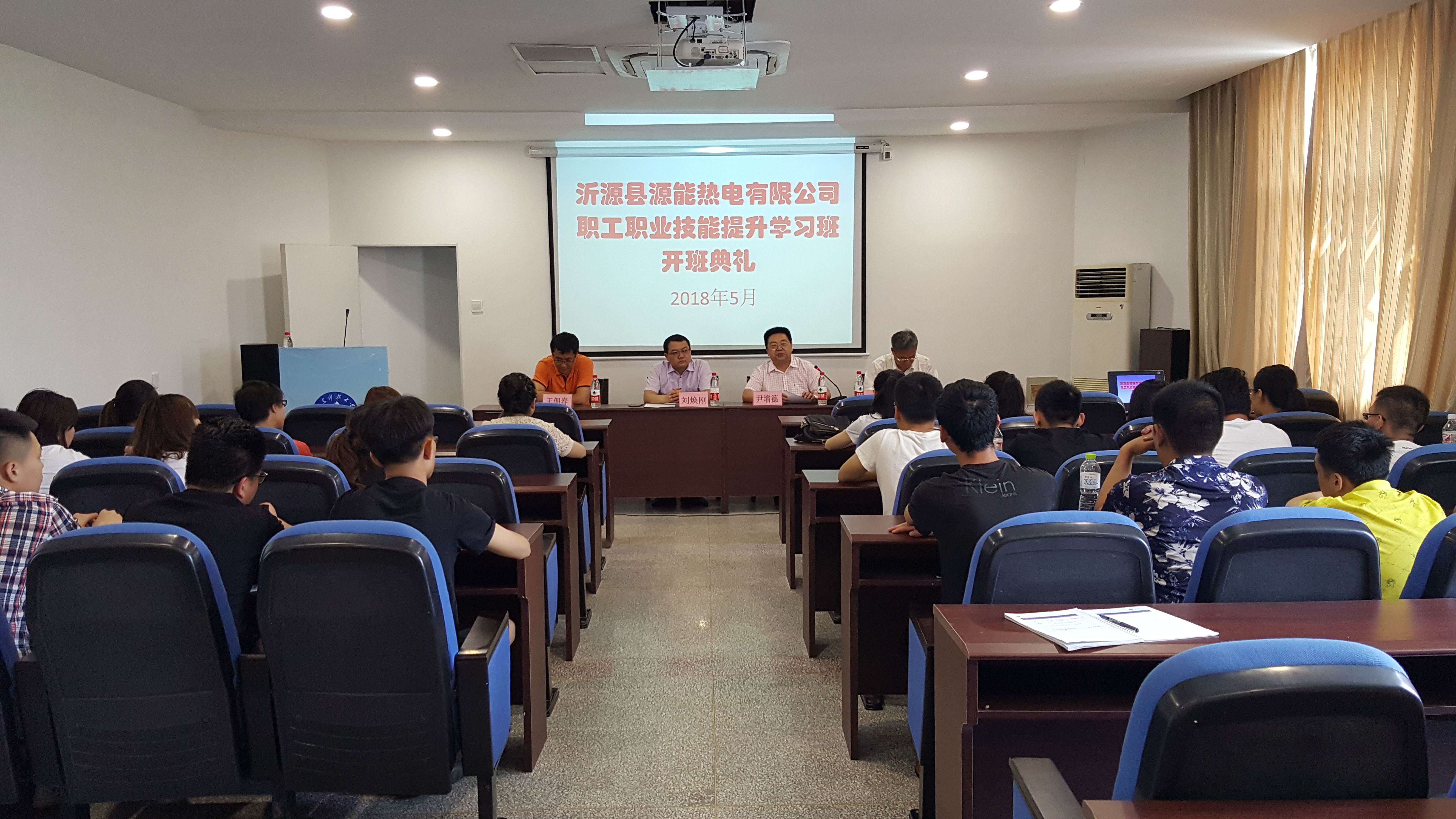 5月14日,沂源县源能热电有限公司员工2018年岗前职业技能提升学习班在jinnianhui今年会举行,源能热电人事部经理刘焕刚、培训主管孙延英,jinnianhui今年会院长尹增德、副院长王文胜、王佃春及学习班全体学员出席开班仪式。